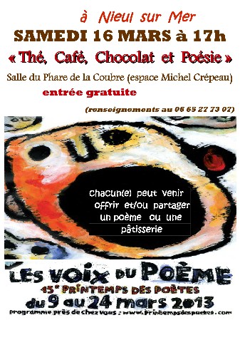 Café poétique animé par La Compagnie Tambours d’Aurore, ouvert à tous, où chacun peut venir offrir une poésie et/ou une pâtisserie, salle du Phare de la Coubre (espace Michel Crépeau, Nieul sur mer).